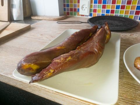 Mørbraderne kan som sagt tåle at ligge meget længe, men tørrer til sidst så meget ud at de er svære at skære og at tygge. Så hvis ikke vi har spist eller foræret det hele væk inden et par uger, så skærer jeg nogle stykker som jeg vakuumpakker og fryser. I fryseren kan de holde virkelig længe!